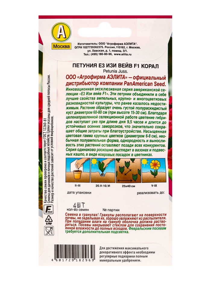 Семена цветов Петуния «Е3 Изи Вейв», F1, корал, драже, PanAmerican Seed, 4 шт., «Агрофирма АЭЛИТА» — Характеристики