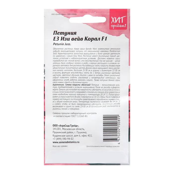 Знаменитый ампельный гибрид многоцветковой петунии, удивляющий своим обильным цветением от американской компании PanAmerican Seed. Характеризуется длительным периодом цветения и устойчивостью к неблагоприятным условиям. Дословно название серии переводится, как «легкая волна», это действительно так же красиво - целью селекции было создание легкого в уходе и хорошо растущего в условиях короткого светового дня растения. Ниспадающие плети покрыты множеством удивительных миниатюрных цветов. Данная серия наращивает массу растения сначала "куполом", достигая 25-38 см в ширину и диаметром 15-30 см, формируя в последствии плети до 1 метра, обильно усыпанные крупными цветками. Цветение обильное, длится с июня по октябрь. Этот уникальный гибрид позволяет создать изысканные и неповторимые композиции при оформлении клумб, рабаток, вазонов и кашпо. Также петунию данной серии смело можно сажать в балконные ящики. Агротехника: Семена покрыты оболочкой! Петуния – мелкосемянная культура, требовательная к условиям выращивания. Посев на рассаду в феврале-марте. Гранулы располагают на поверхности субстрата, не засыпая их почвой, а лишь слегка прижимают и накрывают стеклом или пленкой. Для прорастания семян необходимо хорошее освещение и температура 20-24˚С. Полив производят из опрыскивателя. Всходы появляются на 10-15 день. После появления первого настоящего листа всходы проветривают, периодически снимая стекло и убирая конденсат влаги. Температуру постепенно снижают до 14-16˚С и следят, чтобы не было переувлажнения субстрата. Закаленную рассаду высаживают в грунт по схеме 25×30 см. В дальнейшем уход заключается в рыхлении, поливе и подкормах. Штрих-код –
