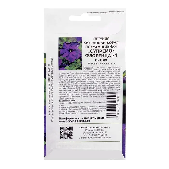 Непрерывно цветущая полу-ампельная «СУПРЕМО», одна из самых эффектных крупноцветковых петуний с усиленным ветвлением. Обладает большей выравненностью, раньше зацветает и обильнее цветет. Высота ее максимум 20 см, а «бросает» побеги и распространяется в стороны до 60 см и более. Скорость роста высокая, растет плотно, образуя чудесную «корону» из цветков. Новые цветоносные побеги образуются в пазухах листьев и равномерно распределяются по всему кусту, благодаря чему растения до конца вегетации сохраняют свою декоративность. Как правило, у стандартных петуний цветение спускается каскадом вниз, обнажая голые стебли в центре растения. «Супремо» была выведена для устранения этого недостатка обычных ампельных петуний. Обладает повышенной устойчивостью к перепадам температур и неблагоприятным погодным условиям. Серия идеально подходит для кашпо, подвесных корзин, ландшафтного дизайна и озеленения. При хорошей агротехнике может цвести круглый год!