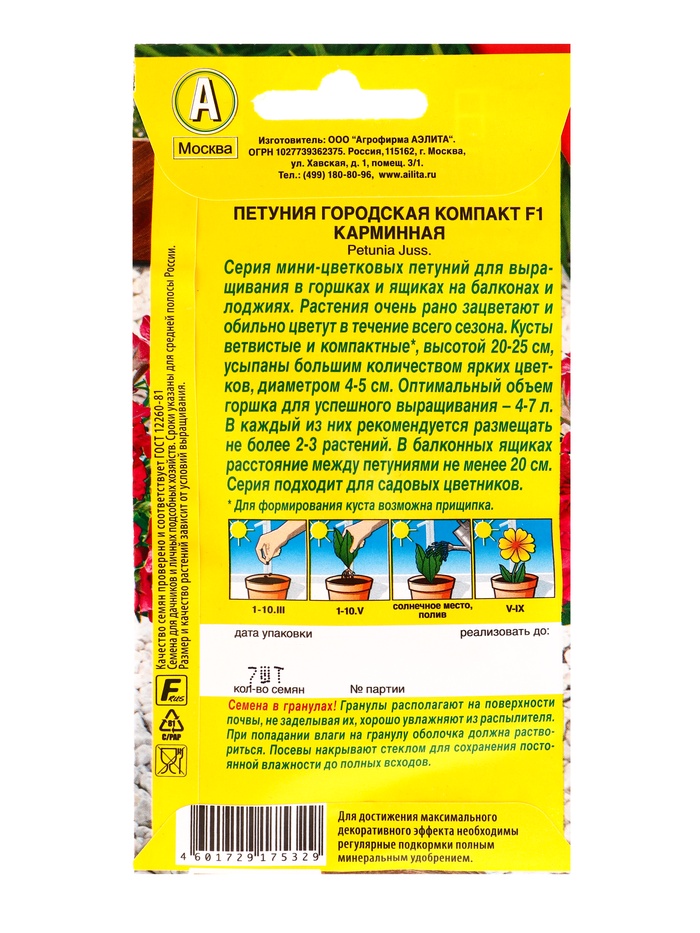 Семена цветов Петуния Городская компакт F1 карминная (драже) Цветущий балкон, Ц/П,7 шт. — Характеристики