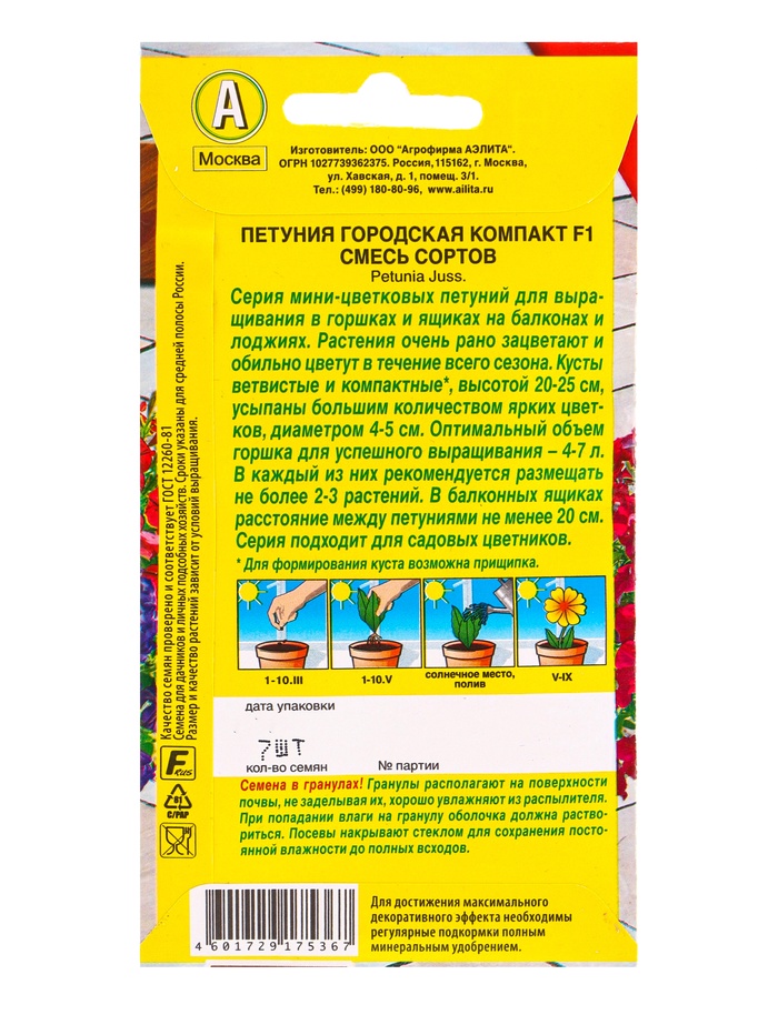 Семена цветов Петуния Городская компакт F1, смесь сортов (драже) Цветущий балкон, Ц/П,7 шт. 1094567 — Характеристики