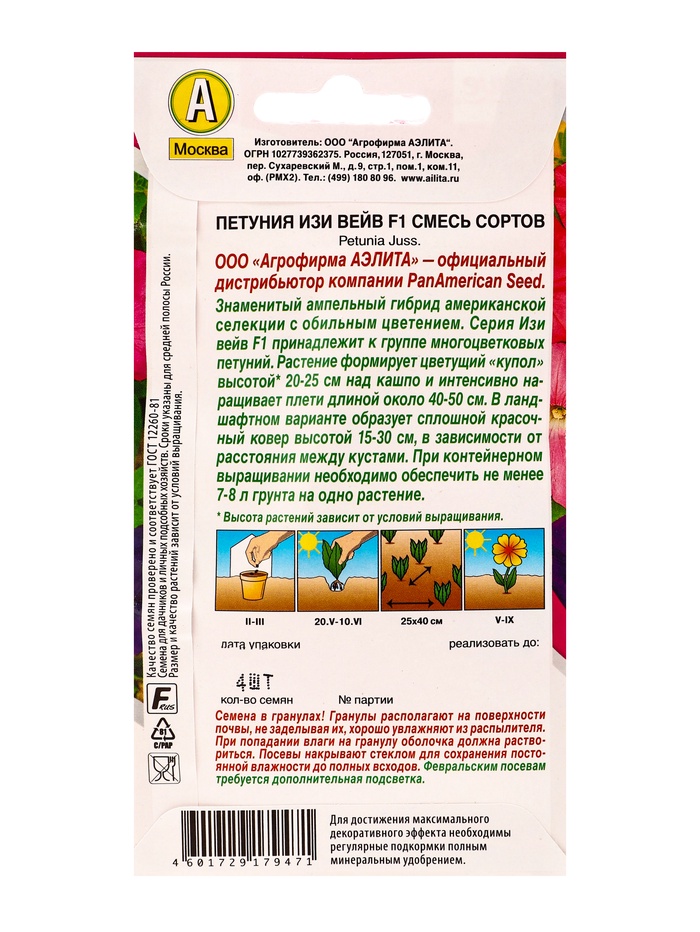 Семена цветов Петуния «Изи вейв», F1, смесь сортов, драже, PanAmerican Seed, 4 шт., «Агрофирма АЭЛИТА» — Характеристики
