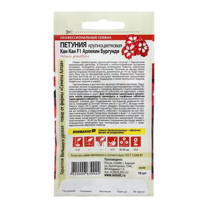 Новая превосходная крупноцветковая петуния с бархатными кружевными цветами. Компактные растения высотой до 25см, с яркими, похожими на звезды, цветками бордово-белой окраски, диаметром 8-10см. Устойчива к неблагоприятным погодным условиям. Незаменима для оформления клумб, рабаток, а так же балконных ящиков, подвесных корзин и кашпо. Семена на рассаду сеют в марте, не заделывая землей, а просто накрывая ящики стеклом. Пока всходы мелкие, их лучше не поливать, а опрыскивать. На открытом воздухе продолжают выращивать с конца мая. Возможно сохранение растений в зимний период в комнатных условиях.