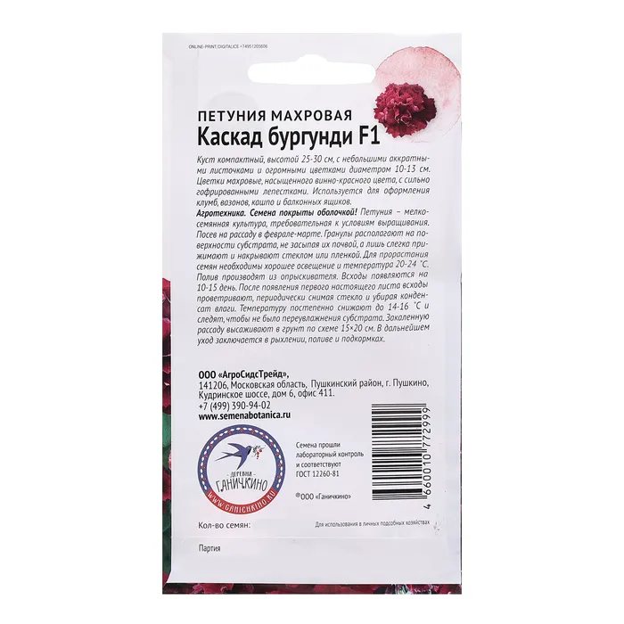 Куст компактный, высотой 25-30 см, с небольшими аккуратными листочками и огромными цветками диаметром 10-13 см. Цветки махровые, насыщенного вино-красного цвета, с сильно гофрированными лепестками. Используется для оформления клумб, вазонов, кашпо и балконных ящиков. Агротехника: Семена покрыты оболочкой! Петуния – мелкосемянная культура, требовательная к условиям выращивания. Посев на рассаду в феврале-марте. Гранулы располагают на поверхности субстрата, не засыпая их почвой, а лишь слегка прижимают и накрывают стеклом или пленкой. Для прорастания семян необходимо хорошее освещение и температура 20-24˚С. Полив производят из опрыскивателя. Всходы появляются на 10-15 день. После появления первого настоящего листа всходы проветривают, периодически снимая стекло и убирая конденсат влаги. Температуру постепенно снижают до 14-16˚С и следят, чтобы не было переувлажнения субстрата. Закаленную рассаду высаживают в грунт по схеме 15×20 см. В дальнейшем уход заключается в рыхлении, поливе и подкормах. Штрих-код - 4660010772999