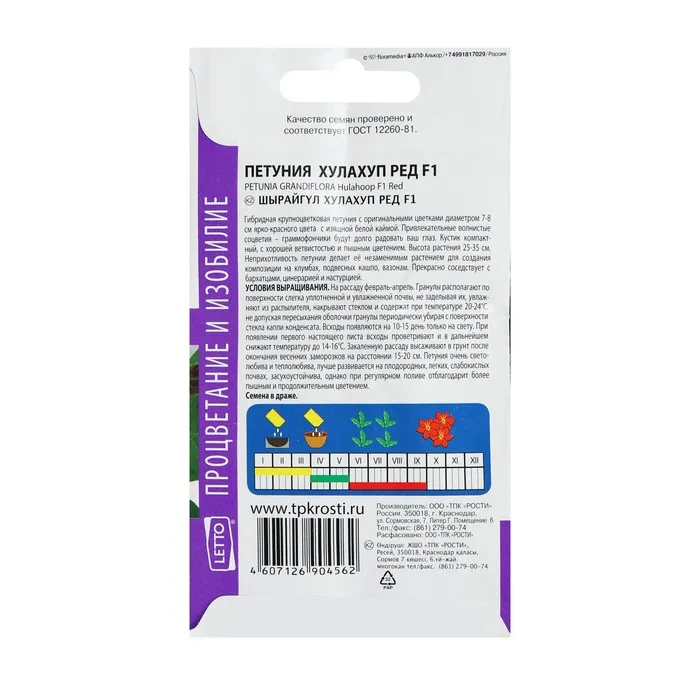 Условия выращивания: на рассаду февраль-апрель. Гранулы располагают по поверхности слегка уплотненной и увлажненной почвы, не заделывая их, увлажняют из распылителя, накрывают стеклом и содержат при температуре 20-24°С, не допуская пересыхания оболочки гранулы периодически убирая с поверхности стекла капли конденсата. Всходы появляются на 10-15 день только на свету. При появлении первого настоящего листа всходы проветривают и в дальнейшем снижают температуру до 14-16°С. Закаленную рассаду высаживают в грунт после окончания весенних заморозков на расстоянии 15-20 см. Петуния очень светолюбива и теплолюбива, лучше развивается на плодородных, легких, слабокислых почвах, засухоустойчива, однако при регулярном поливе отблагодарит более пышным и продолжительным цветением.