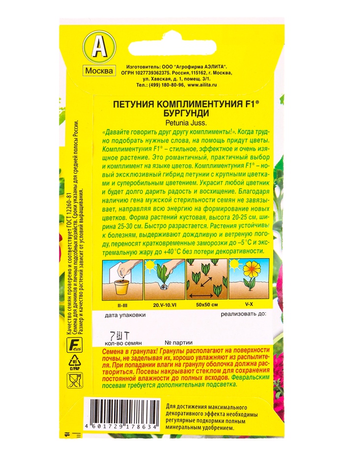 Семена цветов Петуния Комплиментуния F1 бургунди крупноцветковая (драже в пробирке), Ц/П,7 шт. 1094 — Характеристики