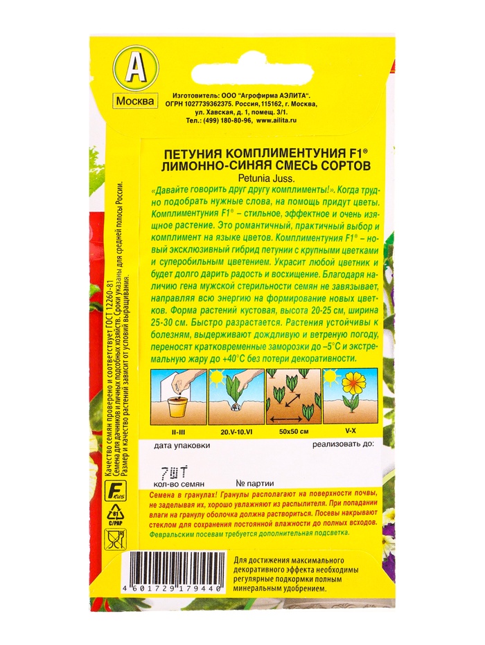 Семена цветов Петуния Комплиментуния F1 лимонно-синяя смесь крупноцветковая (драже), Ц/П,7 шт. 10945 — Характеристики