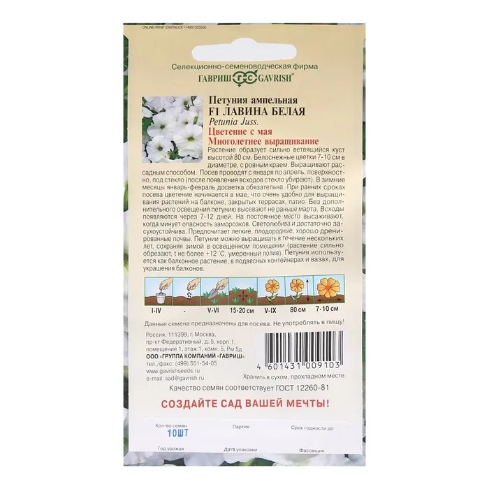 Необыкновенно красивое растение c повисающими побегами длиной до 80 см. Молодые кустики прямостоячие, вырастая, побеги свешиваются и образуют настоящую лавину из крупных белых цветков, расходящимися из центра подобно звезде. Цветки 7-10см в диаметре. Выращивают рассадным способом. Посев проводят с января по апрель, поверхностно, под стекло (после появления всходов стекло убирают). В зимние месяцы январь-февраль досветка обязательна. При ранних сроках посева цветение начинается в мае, что очень удобно для выращивания растений на балконе, закрытых террасах, патио. Без дополнительного освещения петунию высевают не раньше марта. Всходы появляются через 7-12 дней. На постоянное место высаживают, когда минует опасность заморозков. Светолюбива и достаточно засухоустойчива. Предпочитает легкие, плодородные, хорошо дренированные почвы. Петунии можно выращивать в течение нескольких лет, сохраняя зимой в освещенном помещении (растение сильно обрезают, t не более 12°C, умеренный полив). Прекрасно смотрятся отдельные растения петунии, высаженные в группе образуют яркое, нарядное пятно, великолепно украсят балконные ящики, вазы и подвесные кашпо.