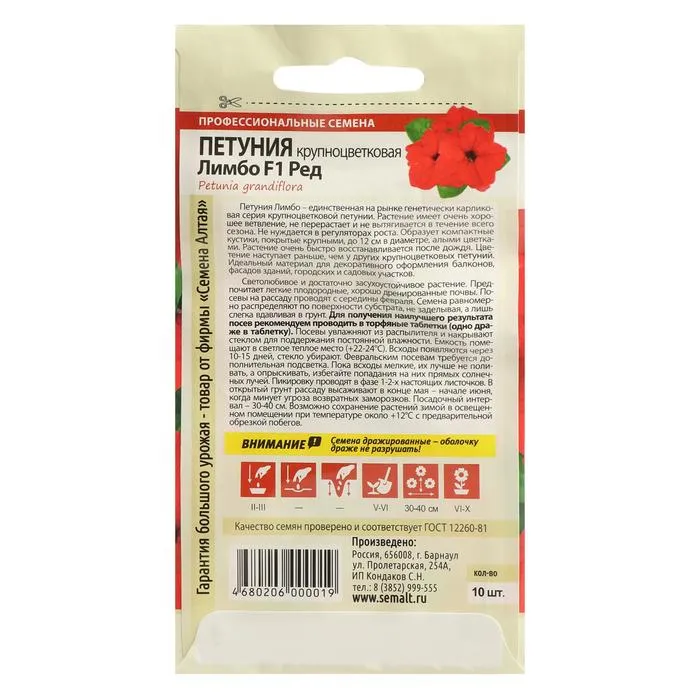 Петуния Лимбо – единственная на рынке генетически карликовая серия крупноцветковой петунии. Растение имеет очень хорошее ветвление, не перерастает и не вытягивается в течение всего сезона. Не нуждается в регуляторах роста. Образует компактные кустики, покрытые крупными, до 12 см в диаметре, алыми цветками. Растение очень быстро восстанавливается после дождя. Цветение наступает раньше, чем у других крупноцветковых петуний. Идеальный материал для декоративного оформления балконов, фасадов зданий, городских и садовых участков.Светолюбивое и достаточно засухоустойчивое растение. Предпочитает легкие плодородные, хорошо дренированные почвы. Посевы на рассаду проводят с середины февраля. Семена равномерно распределяют по поверхности субстрата, не заделывая, а лишь слегка вдавливая в грунт. Для получения наилучшего результата посев рекомендуем проводить в торфяные таблетки (одно драже в таблетку). Посевы увлажняют из распылителя и накрывают стеклом для поддержания постоянной влажности. Емкость помещают в светлое теплое место (+22-24°С). Всходы появляются через 10-15 дней, стекло убирают. Февральским посевам требуется дополнительная подсветка. Пока всходы мелкие, их лучше не поливать, а опрыскивать, избегайте попадания на них прямых солнечных лучей. Пикировку проводят в фазе 1-2-х настоящих листочков. В открытый грунт рассаду высаживают в конце мая - начале июня, когда минует угроза возвратных заморозков. Посадочный интервал – 30-40 см. Возможно сохранение растений зимой в освещенном помещении при температуре около +12°С с предварительной обрезкой побегов. Внимание! Семена дражированные - оболочку драже не разрушать!