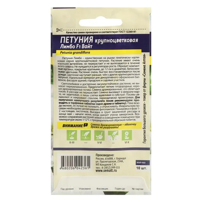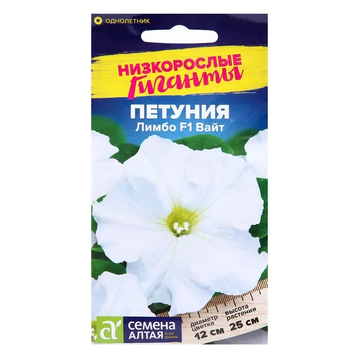 Петуния Лимбо – единственная на рынке генетически карликовая серия крупноцветковой петунии. Растение имеет очень хорошее ветвление, не перерастает и не вытягивается в течение всего сезона. Не нуждается в регуляторах роста. Образует компактные кустики, покрытые крупными, до 12 см в диаметре, белоснежными цветками. Растение очень быстро восстанавливается после дождя. Цветение наступает раньше, чем у других крупноцветковых петуний. Идеальный материал для декоративного оформления балконов, фасадов зданий, городских и садовых участков. Светолюбивое и достаточно засухоустойчивое растение. Предпочитает легкие плодородные, хорошо дренированные почвы. Посевы на рассаду проводят с середины февраля. Семена равномерно распределяют по поверхности субстрата, не заделывая, а лишь слегка вдавливая в грунт. Для получения наилучшего результата посев рекомендуем проводить в торфяные таблетки (одно драже в таблетку). Посевы увлажняют из распылителя и накрывают стеклом для поддержания постоянной влажности. Емкость помещают в светлое теплое место (+22-24°С). Всходы появляются через 10-15 дней, стекло убирают. Февральским посевам требуется дополнительная подсветка. Пока всходы мелкие, их лучше не поливать, а опрыскивать, избегайте попадания на них прямых солнечных лучей. Пикировку проводят в фазе 1-2-х настоящих листочков. В открытый грунт рассаду высаживают в конце мая - начале июня, когда минует угроза возвратных заморозков. Посадочный интервал – 30-40 см. Обильное и продолжительное цветение с июня до осенних заморозков. Возможно сохранение растений зимой в освещенном помещении при температуре около +12°С с предварительной обрезкой побегов. Внимание! Семена дражированные - оболочку драже не разрушать!