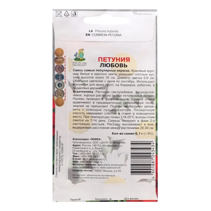 Смесь самых популярных окрасок. Красивые крупные белые и красные цветы украшают плотные кустики высотой около 30 см. Обильное цветение с июня по сентябрь. Используют в клумбах для ярких групп, на бордюрах, рабатках, в подвесных корзинках. . Светолюбивое и достаточно засухоустойчивое растение. Предпочитает легкие плодородные, хорошо дренированные почвы. Посевы на рассаду проводят с середины февраля. Семена равномерно распределяют по поверхности субстрата, не заделывая, а лишь слегка вдавливая в грунт. Для получения наилучшего результата посев рекомендуем проводить в торфяные таблетки (одно драже в таблетку).