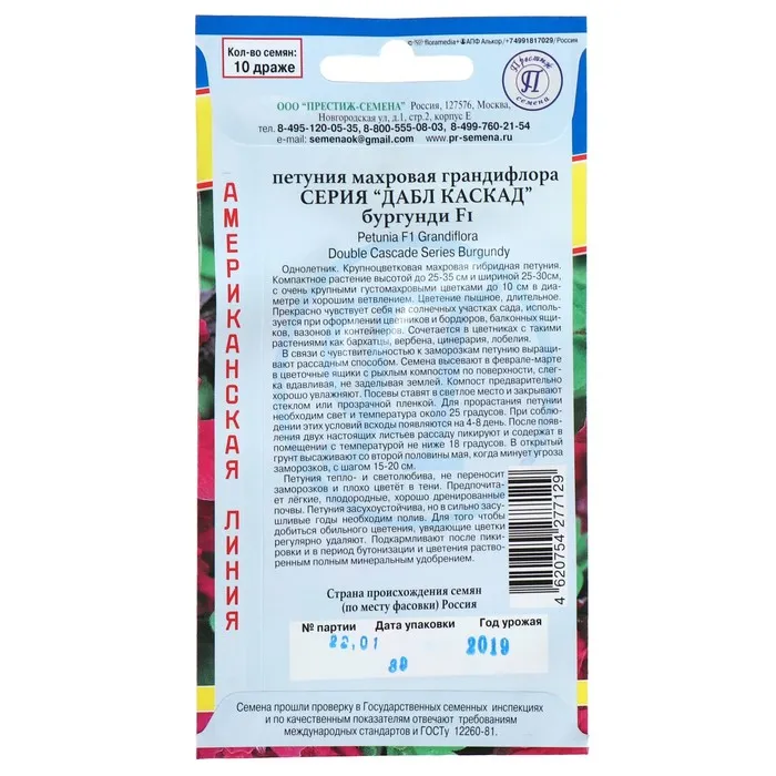 Однолетник. Крупноцветковая махровая гибридная петуния. Компактное растение высотой до 25-35 см и шириной 25-30см, с очень крупными густомахровыми цветками до 10 см в диаметре и хорошим ветвлением. Цветение пышное, длительное. Прекрасно чувствует себя на солнечных участках сада, используется при оформлении цветников и бордюров, балконных ящиков, вазонов и контейнеров. Сочетается в цветниках с такими растениями как бархатцы, вербена, цинерария, лобелия.