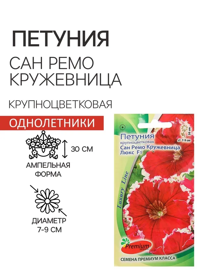 Это компактное растение высотой до 25-35 см и шириной 25-30 см, отличающееся очень крупными густомахровыми цветками с белой каймой, диаметром до 10 см.