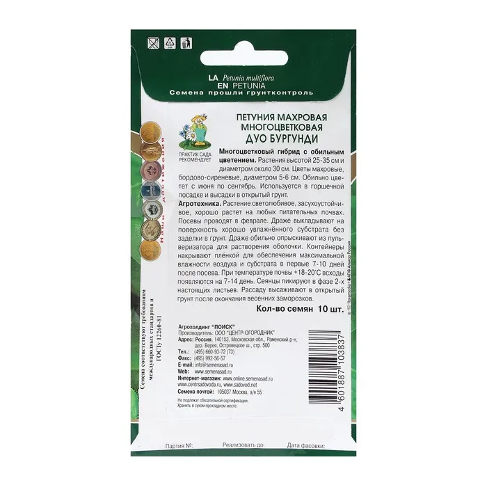 Семена Петуния махровая многоцветковая Дуо бургунди. Многочисленные махровые шарики цветов на раскидистых кустиках. Растения высотой 25-35 см и диаметром около 30 см. Цветы махровые бордово-сиреневые. Обильно цветет с июня по сентябрь. Растение светолюбивое, засухоустойчивое, хорошо растет на любых питательных почвогрунтах. Посев семян на рассаду проводят в мае - июне. Семена слегка вдавливают в почву, землей не присыпают. Посадочную емкость накрывают стеклом и ставят в освещенное место. Всходы появляются на 14-20 день. Сеянцы пикируют в фазе 2-х настоящих листьев. Рассаду высаживают в открытый грунт после окончания весенних заморозков.