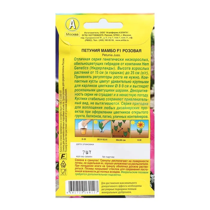 Посев на рассаду с февраля до апреля. Семена в гранулах. Посев поверхностный, без заделки (семена прорастают на свету), под стекло или пленку для сохранения постоянной влажности до полных всходов. Гранулы при посеве должны раствориться. Февральским посевам требуется дополнительная подсветка. Всходы появляются на 5-6 день. Пикировка в фазе 1-2-х настоящих листьев. Высадка в грунт закаленной рассады в конце мая.