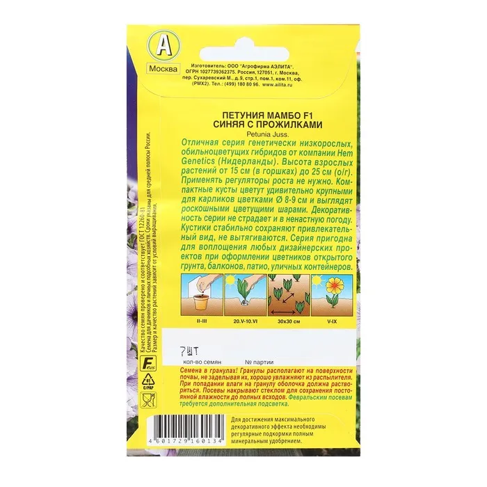 Семена в гранулах. Гранулы располагают на поверхности почвы, не заделывая их, хорошо увлажняют из распылителя. При попадании влаги на гранулу оболочка должна раствориться. Посевы накрывают стеклом для сохранения постоянной влажности до полных всходов. Февральским посевам требуется дополнительная подсветка.