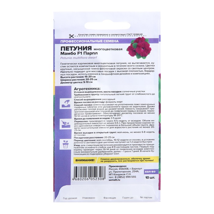 Генетически низкорослая серия многоцветковой петунии. Растения формируют плотные компактные кустики высотой до 25 см, покрытые крупными, диаметром до 10 см, пурпурными цветками. Не вытягиваются в течение всего сезона, имеют очень хорошее ветвление. Отличаются повышенной устойчивостью к неблагоприятным погодным условиям. Петунии серии Мамбо широко используются для оформления клумб, рабаток, отлично смотрятся в вазонах, кашпо, подвесных корзинах, балконных ящиках. Светолюбивое и достаточно засухоустойчивое растение. Предпочитает легкие плодородные, хорошо дренированные почвы. Посевы на рассаду проводят с середины февраля. Семена равномерно распределяют по поверхности субстрата, не заделывая, а лишь слегка вдавливая в грунт. Для получения наилучшего результата посев рекомендуем проводить в торфяные таблетки (одно драже в таблетку). Посевы увлажняют из распылителя и накрывают стеклом для поддержания постоянной влажности. Емкость помещают в светлое теплое место (+22-24°С). Всходы появляются через 10-15 дней, стекло убирают. Февральским посевам требуется дополнительная подсветка. Пока всходы мелкие, их лучше не поливать, а опрыскивать, избегайте попадания на них прямых солнечных лучей. Пикировку проводят в фазе 1-2-х настоящих листочков. В открытый грунт рассаду высаживают в конце мая - начале июня, когда минует угроза возвратных заморозков. Посадочный интервал – 30-40 см. Обильное и продолжительное цветение с июня до осенних заморозков. Возможно сохранение растений зимой в освещенном помещении при температуре около +12°С с предварительной обрезкой побегов. Внимание! Семена дражированные - оболочку драже не разрушать!