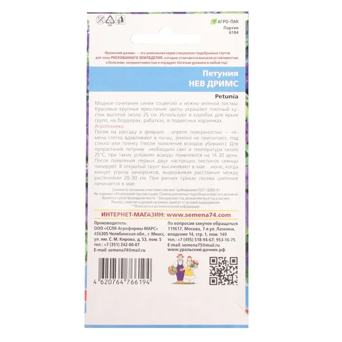 Посев на рассаду в феврале-апреле поверхностно – семена слегка вдавливают в почву, землей не присыпают, под стекло или пленку (после появления всходов убирают). Для прорастания петунии необходим свет и температура около 25°С, при таких условиях всходы появляются на 14-20 день. После появления первых двух настоящих листиков сеянцы пикируют. В открытый грунт высаживают в мае-июне, когда минует угроза заморозков, выдерживая расстояние между растениями 20-30 см. При ранних сроках посева цветение начинается в мае.