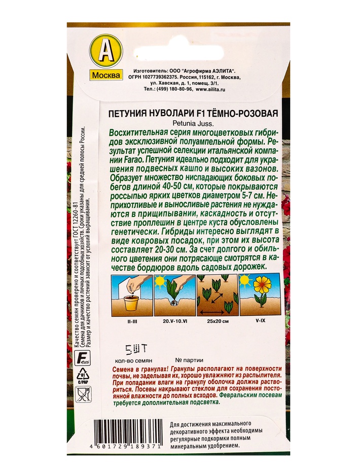 Семена цветов Петуния «Нуволари», F1, полуампельная, тёмно-розовая, драже, Farao, 5 шт., «Агрофирма АЭЛИТА» — Характеристики
