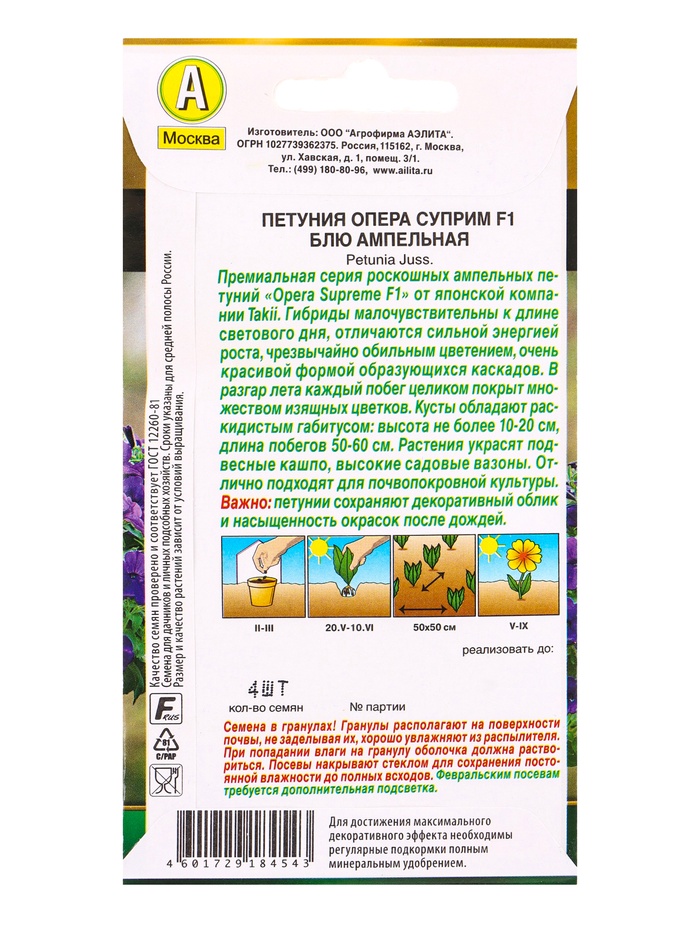 Семена цветов Петуния Опера суприм F1 блю ампельная (драже) С. Takii Seed , Ц/П,4 шт. — Характеристики