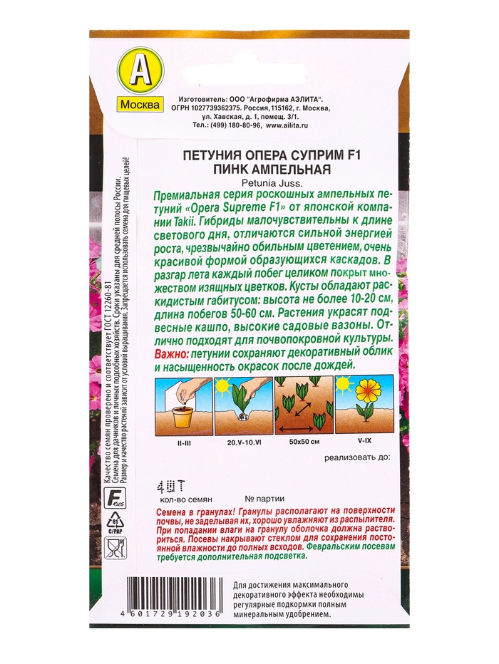 Семена цветов Петуния Опера суприм F1 пинк ампельная (драже в пробирке) Золотая серия, Ц/П,4 шт. 10 — Характеристики
