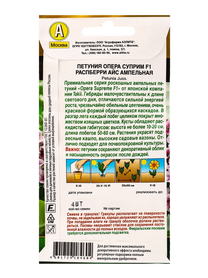 Семена цветов Петуния «Опера суприм», F1, распберри айс ампельная, драже, Takii Seed, 4 шт., «Агрофирма АЭЛИТА» — Характеристики