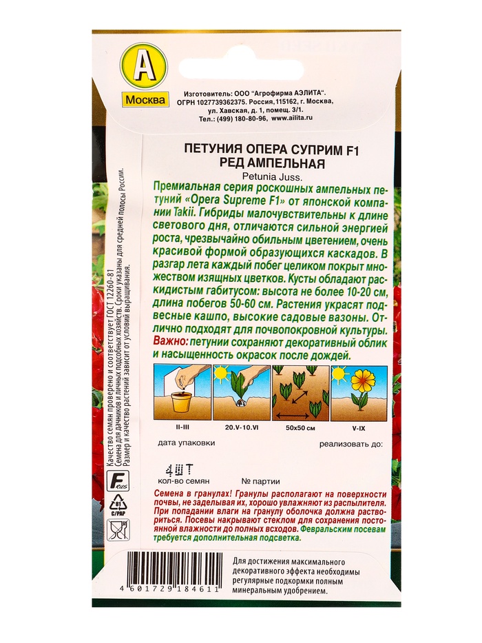 Семена цветов Петуния Опера суприм F1 ред ампельная (драже) С. Takii Seed , Ц/П,4 шт. — Характеристики