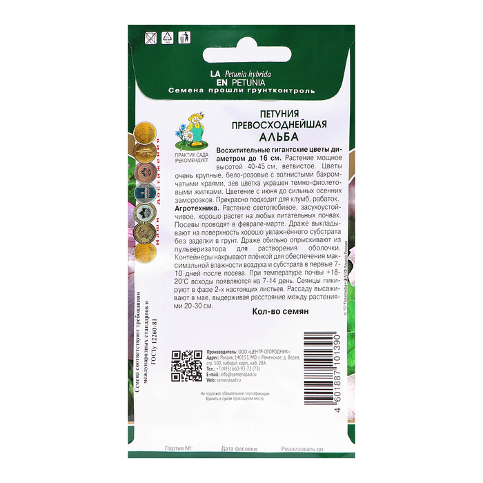 Восхитительные гигантские цветы диаметром до 16см. Растение мощное высотой 40-45 см, ветвистое. Цветы очень крупные, бело-розовые с волнистыми бахромчатыми краями, зев цветка украшен темно-фиолетовыми жилками. Цветение с июня до сильных осенних заморозков. Прекрасно подходит для клумб, рабаток.Агротехника. Растение светолюбивое, засухоустойчивое, хорошо растет на любых питательных почвогрунтах. Посев семян на рассаду проводят в феврале-марте. Семена слегка вдавливают в почву, землей не присыпают. Посадочную емкость накрывают стеклом и ставят в освещенное место. При температуре почвы +18-20°С всходы появляются на 14-20 день. Сеянцы пикируют в фазе 2-х настоящих листьев. Рассаду высаживают в открытый грунт после окончания весенних заморозков.Семена соответствуют требованиям международных стандартов и ГОСТу РФ 12260-81