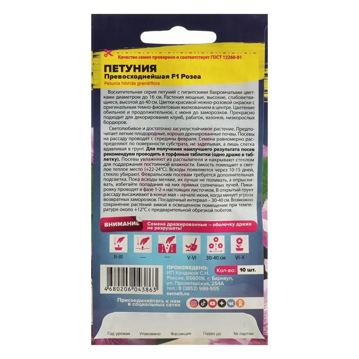 Восхитительная серия петуний с гигантскими бахромчатыми цветками диаметром до 16 см. Растения мощные, высокие, слабоветвящиеся, высотой до 40 см. Цветки красивой нежно-розовой окраски с оригинальным темно-фиолетовым жилкованием в центре. Цветение обильное и продолжительное, с июня до заморозков. Прекрасно подходит для декорирования клумб, рабаток, вазонов, низкорослых бордюров. Светолюбивое и достаточно засухоустойчивое растение. Предпочитает легкие плодородные, хорошо дренированные почвы. Посевы на рассаду проводят с середины февраля. Семена равномерно распределяют по поверхности субстрата, не заделывая, а лишь слегка вдавливая в грунт. Для получения наилучшего результата посев рекомендуем проводить в торфяные таблетки (одно драже в таблетку). Посевы увлажняют из распылителя и накрывают стеклом для поддержания постоянной влажности. Емкость помещают в светлое теплое место (+22-24°С). Всходы появляются через 10-15 дней, стекло убирают. Февральским посевам требуется дополнительная подсветка. Пока всходы мелкие, их лучше не поливать, а опрыскивать, избегайте попадания на них прямых солнечных лучей. Пикировку проводят в фазе 1-2-х настоящих листочков. В открытый грунт рассаду высаживают в конце мая - начале июня, когда минует угроза возвратных заморозков. Посадочный интервал – 30-40 см. Возможно сохранение растений зимой в освещенном помещении при температуре около +12°С с предварительной обрезкой побегов. Внимание! Семена дражированные - оболочку драже не разрушать!