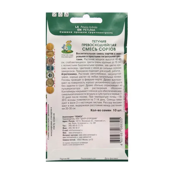 Восхитительная смесь сортов с махровыми и простыми гигантскими цветами. Растение мощное высотой 40-45 см, слабоветвящееся. Цветы очень крупные до 16 см, с волнистыми бахромчатыми краями, зев цветка красиво жилкован. Цветение с июня до сильных осенних заморозков. Прекрасно подходит для клумб, рабаток. Агротехника. Растение светолюбивое, засухоустойчивое, хорошо растет на любых питательных почвогрунтах. Посев семян на рассаду проводят в феврале-марте. Семена слегка вдавливают в почву, землей не присыпают. Посадочную емкость накрывают стеклом и ставят в освещенное место. При температуре почвы +18-20°С всходы появляются на 14-20 день. Сеянцы пикируют в фазе 2-х настоящих листьев. Рассаду высаживают в открытый грунт после окончания весенних заморозков.
