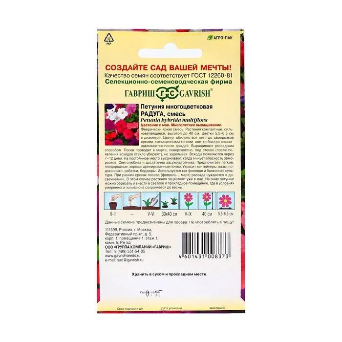 Образует сильно ветвящийся куст высотой 40 см. Выращивают рассадным способом. Посев проводят с января по апрель, поверхностно, под стекло (после появления всходов стекло убирают). В зимние месяцы январь-февраль досветка обязательна. При ранних сроках посева цветение начинается в мае, что очень удобно для выращивания растений на балконе, закрытых террасах, патио. Без дополнительного освещения петунию высевают не раньше марта. Всходы появляются через 7-12 дней. На постоянное место высаживают, когда минует опасность заморозков. Цветет с июня по сентябрь. Цветки до 7 см в диаметре. Светолюбива и достаточно засухоустойчива. Предпочитает легкие, плодородные, хорошо дренированные почвы.