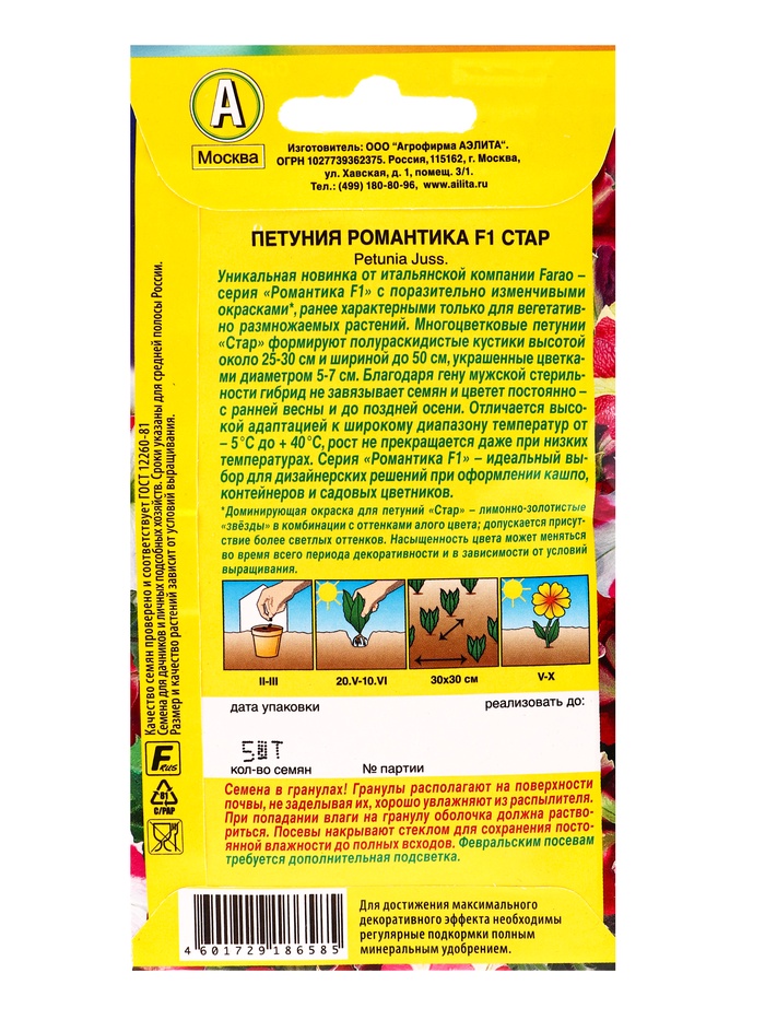 Семена цветов Петуния «Романтика», F1, стар, драже в пробирке, Farao, 5 шт., «Агрофирма АЭЛИТА» — Характеристики