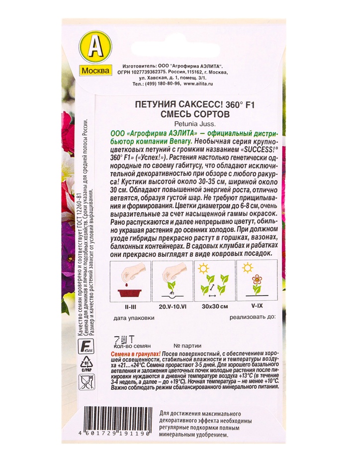 Семена цветов Петуния САКСЕСС! 360° F1, смесь сортов (драже) Benary, Ц/П,7 шт. — Характеристики