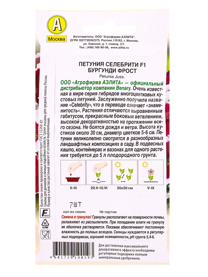 Семена цветов Петуния «Селебрити», F1, бургунди, многоцветковая, драже, Benary, 7 шт. — Характеристики