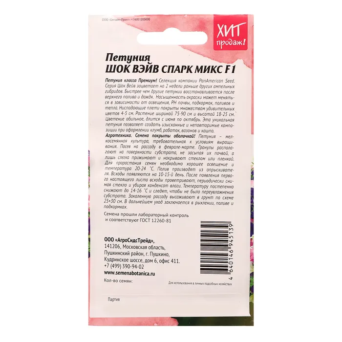 Петуния класса Премиум! Селекция компании PanAmerican Seed. Серия Шок Вейв зацветает на 2 недели раньше других ампельных гибридов. Быстрее чем другие петунии восстанавливается после верхнего полива и дождя. Оригинальная окраска от нежной серебристо-лавандовой до темно-синей. Насыщенность окраски может меняться в зависимости от освещения, PH почвы, подкормок, поливов и тепла. Ниспадающие плети покрыты множеством удивительных цветов 4-5 см. Растение шириной 75-90 см и высотой 18-25 см. Цветение обильное, длится с июня по октябрь. Эта уникальная петуния позволяет создать изысканные и неповторимые композиции при оформлении клумб, рабаток, вазонов и кашпо. Агротехника: Семена покрыты оболочкой! Петуния – мелкосемянная культура, требовательная к условиям выращивания. Посев на рассаду в феврале-марте. Гранулы располагают на поверхности субстрата, не засыпая их почвой, а лишь слегка прижимают и накрывают стеклом или пленкой. Для прорастания семян необходимо хорошее освещение и температура 20-24˚С. Полив производят из опрыскивателя. Всходы появляются на 10-15 день. После появления первого настоящего листа всходы проветривают, периодически снимая стекло и убирая конденсат влаги. Температуру постепенно снижают до 14-16˚С и следят, чтобы не было переувлажнения субстрата. Закаленную рассаду высаживают в грунт по схеме 25×30 см. В дальнейшем уход заключается в рыхлении, поливе и подкормах. Штрих-код –