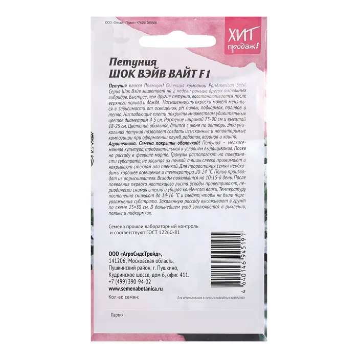 Петуния класса Премиум! Селекция компании PanAmerican Seed. Серия Шок Вейв зацветает на 2 недели раньше других ампельных гибридов. Быстрее чем другие петунии восстанавливается после верхнего полива и дождя. Оригинальная окраска от нежной серебристо-лавандовой до темно-синей. Насыщенность окраски может меняться в зависимости от освещения, PH почвы, подкормок, поливов и тепла. Ниспадающие плети покрыты множеством удивительных цветов 4-5 см. Растение шириной 75-90 см и высотой 18-25 см. Цветение обильное, длится с июня по октябрь. Эта уникальная петуния позволяет создать изысканные и неповторимые композиции при оформлении клумб, рабаток, вазонов и кашпо. Агротехника: Семена покрыты оболочкой! Петуния – мелкосемянная культура, требовательная к условиям выращивания. Посев на рассаду в феврале-марте. Гранулы располагают на поверхности субстрата, не засыпая их почвой, а лишь слегка прижимают и накрывают стеклом или пленкой. Для прорастания семян необходимо хорошее освещение и температура 20-24˚С. Полив производят из опрыскивателя. Всходы появляются на 10-15 день. После появления первого настоящего листа всходы проветривают, периодически снимая стекло и убирая конденсат влаги. Температуру постепенно снижают до 14-16˚С и следят, чтобы не было переувлажнения субстрата. Закаленную рассаду высаживают в грунт по схеме 25×30 см. В дальнейшем уход заключается в рыхлении, поливе и подкормах. Штрих-код –