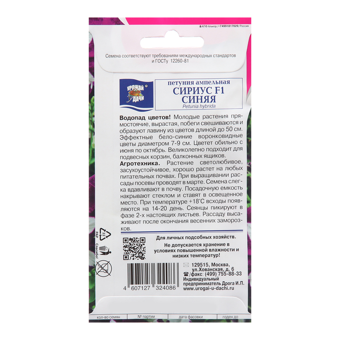 Семена цветов Петуния "СИРИУС", Синяя, F1, 10шт — Характеристики
