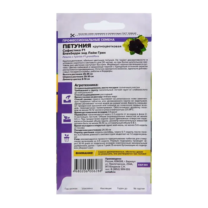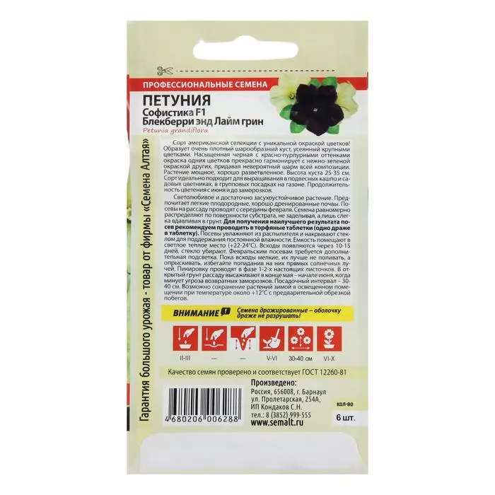 Сорт американской селекции с уникальной окраской цветков! Образует очень плотный шарообразный куст, усеянный крупными цветками. Насыщенная черная с красно-пурпурными оттенками окраска одних цветков прекрасно гармонирует с нежно-зеленой окраской других, предавая невероятный шарм всей композиции. Растение мощное, хорошо разветвленное. Высота куста 25-35 см. Сорт идеально подходит для выращивания в подвесных кашпо и садовых цветниках, в групповых посадках на газоне. Продолжительность цветения с июня и до заморозков.Светолюбивое и достаточно засухоустойчивое растение. Предпочитает легкие плодородные, хорошо дренированные почвы. Посевы на рассаду проводят с середины февраля. Семена равномерно распределяют по поверхности субстрата, не заделывая, а лишь слегка вдавливая в грунт. Для получения наилучшего результата посев рекомендуем проводить в торфяные таблетки (одно драже в таблетку). Посевы увлажняют из распылителя и накрывают стеклом для поддержания постоянной влажности. Емкость помещают в светлое теплое место (+22-24°С). Всходы появляются через 10-15 дней, стекло убирают. Февральским посевам требуется дополнительная подсветка. Пока всходы мелкие, их лучше не поливать, а опрыскивать, избегайте попадания на них прямых солнечных лучей. Пикировку проводят в фазе 1-2-х настоящих листочков. В открытый грунт рассаду высаживают в конце мая - начале июня, когда минует угроза возвратных заморозков. Посадочный интервал – 30-40 см. Возможно сохранение растений зимой в освещенном помещении при температуре около +12°С с предварительной обрезкой побегов. Внимание! Семена дражированные - оболочку драже не разрушать!