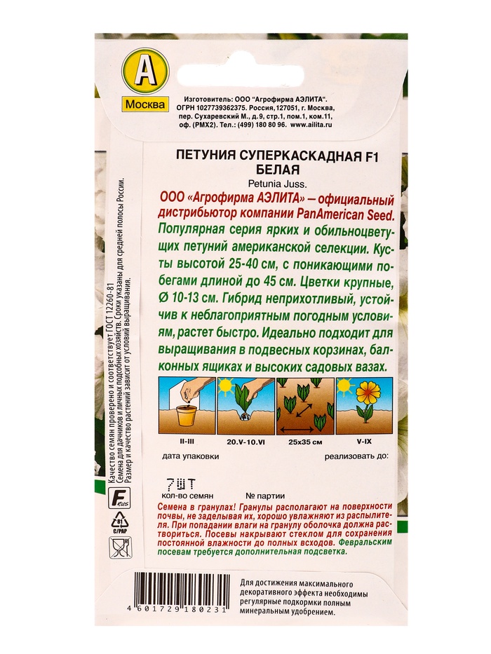 Семена цветов Петуния «суперкаскадная», F1, белая, драже, PanAmerican Seed, 7 шт., «Агрофирма АЭЛИТА» — Характеристики
