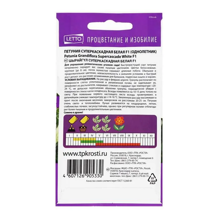 На рассаду в феврале – апреле. Гранулы располагают по поверхности слега уплотненной и увлажненной почвы, не заделывают их, увлажняют из распылителя, накрывают стеклом и содержат при температуре +20 – 24 ℃, не допуская пересыхания оболочки гранулы, периодически убирая со свету. При появлении первого листа, всходы проветривают, в дальнейшем снижают температуру до +14 - 16 ℃. Заклеенную рассаду высаживают в грунт после окончания весенних заморозков на расстоянии 20 – 25 см. Петуния очень свето- и теплолюбива. Лучше развивается на плодородных, легких, слабокислых почвах, засухоустойчива, однако при регулярном поливе отблагодарит более пышным и продолжительным цветением.