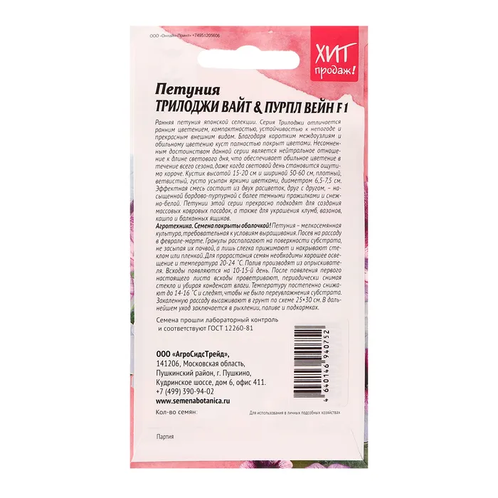 Ранняя петуния японской селекции. Серия Трилоджи отличается ранним цветением, компактностью, устойчивостью к непогоде и прекрасным внешним видом. Благодаря коротким междоузлиям и обильному цветению куст полностью покрыт цветами._x005F_x000B_Несомненным достоинством данной серии является нейтральное отношение к длине светового дня, что обеспечивает обильное цветение в течение всего сезона, даже когда световой день становится ощутимо короче. Кустик высотой 15-20 см и шириной 50-60 см, плотный, ветвистый, густо усыпан яркими цветками, диаметром 6,5 – 7,5 см. Эффектная смесь состоит из двух расцветок, прекрасно сочетающихся друг с другом, насыщенно голубо-синей и снежно белой. Петунии этой серии прекрасно подходят для создания массовых ковровых посадок, а также для украшения клумб, вазонов, кашпо и балконных ящиков. Агротехника: Семена покрыты оболочкой! Петуния – мелкосемянная культура, требовательная к условиям выращивания. Посев на рассаду в феврале-марте. Гранулы располагают на поверхности субстрата, не засыпая их почвой, а лишь слегка прижимают и накрывают стеклом или пленкой. Для прорастания семян необходимо хорошее освещение и температура 20-24˚С. Полив производят из опрыскивателя. Всходы появляются на 10-15 день. После появления первого настоящего листа всходы проветривают, периодически снимая стекло и убирая конденсат влаги. Температуру постепенно снижают до 14-16˚С и следят, чтобы не было переувлажнения субстрата. Закаленную рассаду высаживают в грунт по схеме 15×20 см. В дальнейшем уход заключается в рыхлении, поливе и подкормах. Штрих-код -