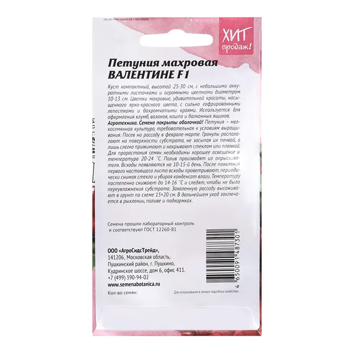 Куст компактный, высотой 25-30 см, с небольшими аккуратными листочками и огромными цветками диаметром 10-13 см. Цветки махровые, удивительной красоты насыщенного ярко-красного цвета, с сильно гофрированными лепестками и бахромчатыми краями. Используется для оформления клумб, вазонов, кашпо и балконных ящиков. Агротехника: Семена покрыты оболочкой! Петуния – мелкосемянная культура, требовательная к условиям выращивания. Посев на рассаду в феврале-марте. Гранулы располагают на поверхности субстрата, не засыпая их почвой, а лишь слегка прижимают и накрывают стеклом или пленкой. Для прорастания семян необходимо хорошее освещение и температура 20-24˚С. Полив производят из опрыскивателя. Всходы появляются на 10-15 день. После появления первого настоящего листа всходы проветривают, периодически снимая стекло и убирая конденсат влаги. Температуру постепенно снижают до 14-16˚С и следят, чтобы не было переувлажнения субстрата. Закаленную рассаду высаживают в грунт по схеме 15×20 см. В дальнейшем уход заключается в рыхлении, поливе и подкормах. Штрих-код -