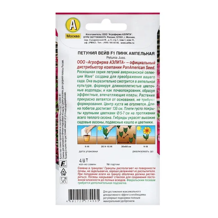 Семена цветов Петуния "Вейв" F1 пинк ампельная, ц/п, 4 шт — Характеристики