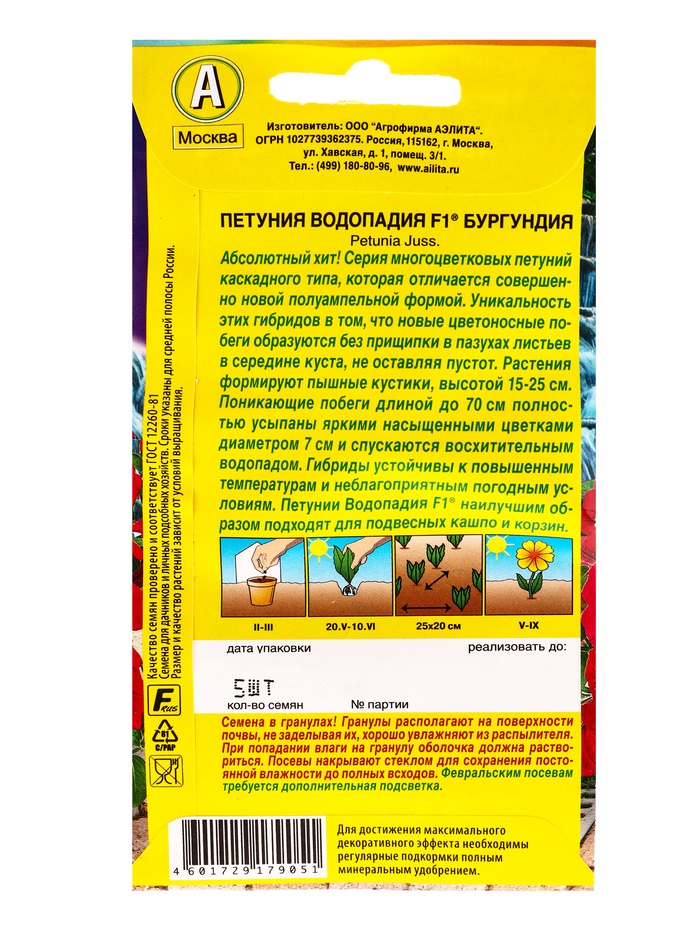Семена цветов Петуния ВОДОПАДИЯ F1 бургундия (драже в пробирке), Ц/П,5 шт. — Характеристики