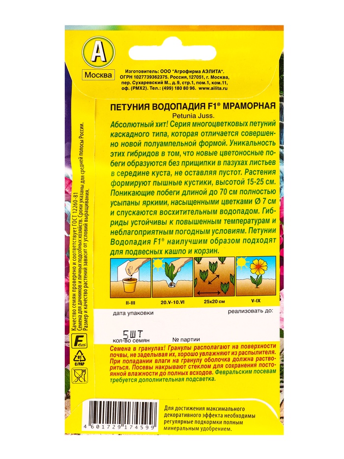 Семена цветов Петуния ВОДОПАДИЯ F1 мраморная (драже в пробирке), Ц/П,5 шт. — Характеристики