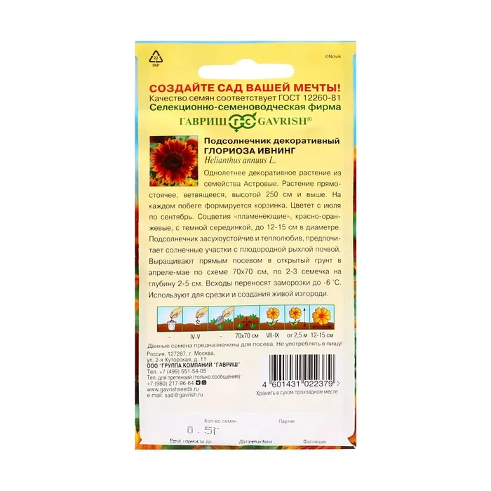 Однолетнее декоративное растение из семейства Астровые. Растение прямостоячее, ветвящееся, высотой 130 см. На каждом побеге формируется корзинка. Цветет с июля по сентябрь. Соцветия пламенеюще-красный с темной серединкой, до 12-15 см в диаметре. Засухоустойчив и теплолюбив, предпочитает солнечные участки с плодородной рыхлой почвой. Выращивают прямым посевом в открытый грунт в апреле-мае по схеме 70 х 70 см, по 2-3 семечки на глубину 2-5 см. Всходы переносят заморозки до -6°C. Используется для посадки на клумбах, в группах, рабатках. Декоративный подсолнечник - прекрасное растение для получения срезки и создания цветочных и декоративных композиций.