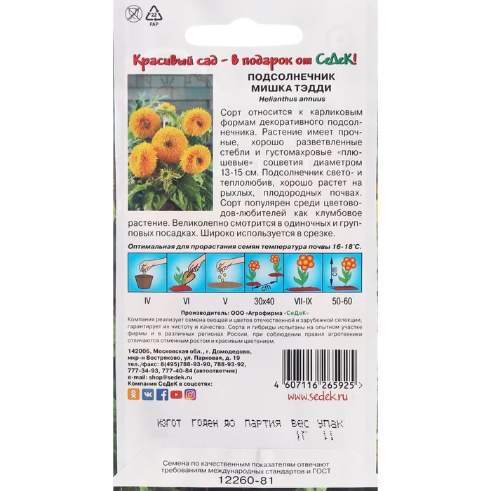Семена цветов Подсолнечник F1 «Мишка Тэдди », 1 г — Характеристики