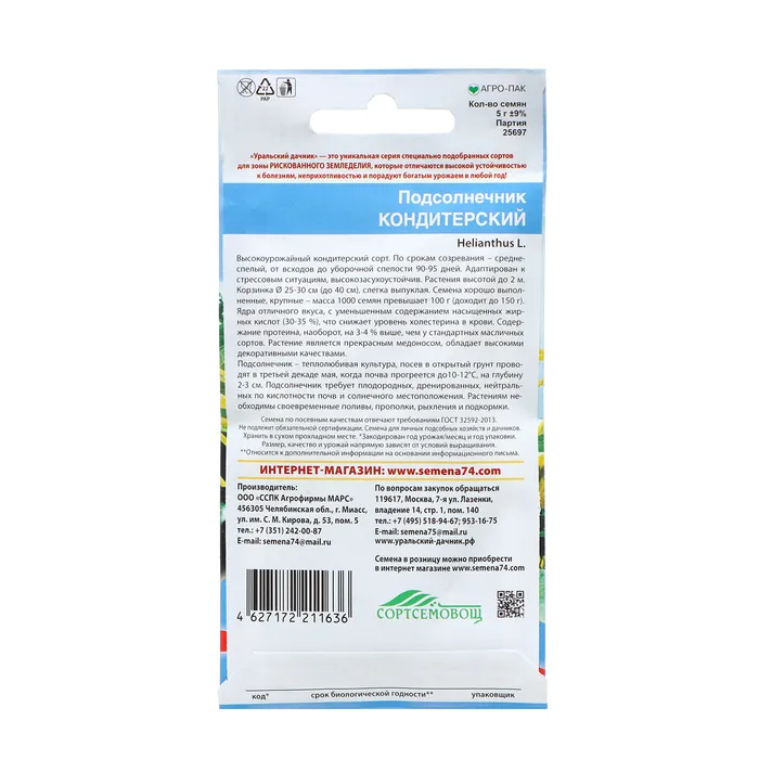Семена Цветов Подсолнечник "Кондитерский" , 0 ,05 г — Характеристики