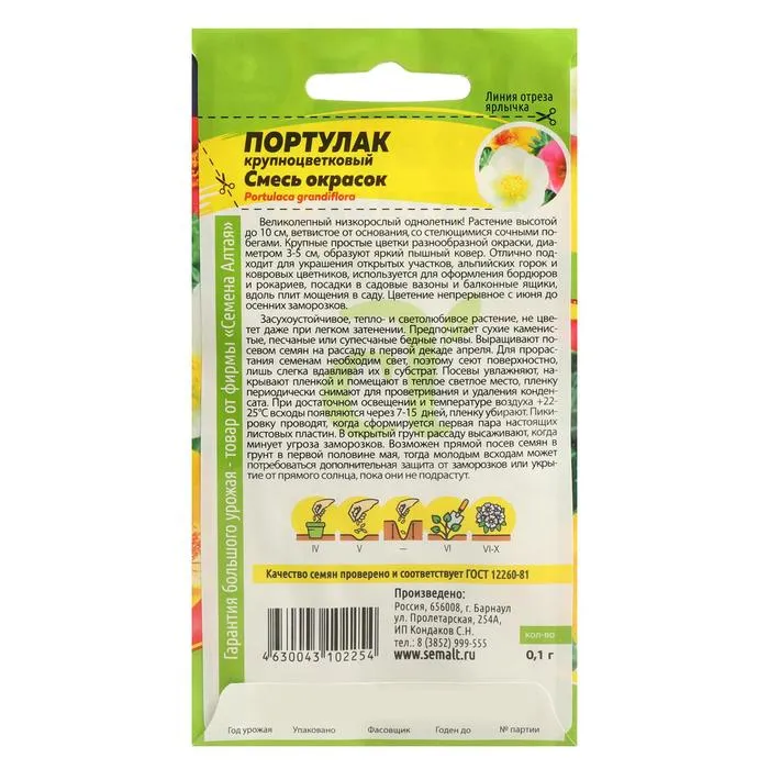 Великолепный низкорослый однолетник! Растение высотой до 10 см, ветвистое от основания со стелющимися сочными побегами. Крупные простые цветки разнообразной окраски, диаметром 3-5 см, образуют яркий пышный ковер. Отлично подходит для открытых участков, альпийских горок и ковровых цветников, используется для оформления бордюров и рокариев, посадки в вазоны и балконные ящики, вдоль плит мощения в саду. Цветение непрерывное с июня до заморозков. Засухоустойчивое, тепло- и светолюбивое растение, не цветет даже при легком затенении. Предпочитает сухие каменистые, песчаные или супесчаные бедные почвы. Выращивают посевом семян на рассаду в первой декаде апреля. Для прорастания семенам необходим свет, поэтому сеют поверхностно, лишь слегка вдавливая их в субстрат. Посевы увлажняют, накрывают пленкой и помещают в теплое светлое место, пленку периодически снимают для проветривания и удаления конденсата. При достаточном освещении и температуре воздуха +22-25°С всходы появляются через 7-15дней, пленку убирают. Пикировку проводят, когда сформируется первая пара настоящих листовых пластин. В открытый грунт рассаду высаживают, когда минует угроза заморозков. Посадочное расстояние 25-30 см. Возможен прямой посев семян в грунт в первой половине мая, тогда молодым всходам может потребоваться дополнительная защита от заморозков или укрытие от прямого солнца, пока они не подрастут.