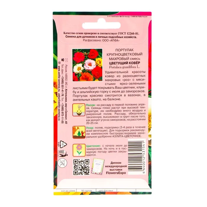 Семена цветов Портулак "Цветущий ковёр" махровый смесь, 0,1 г — Характеристики